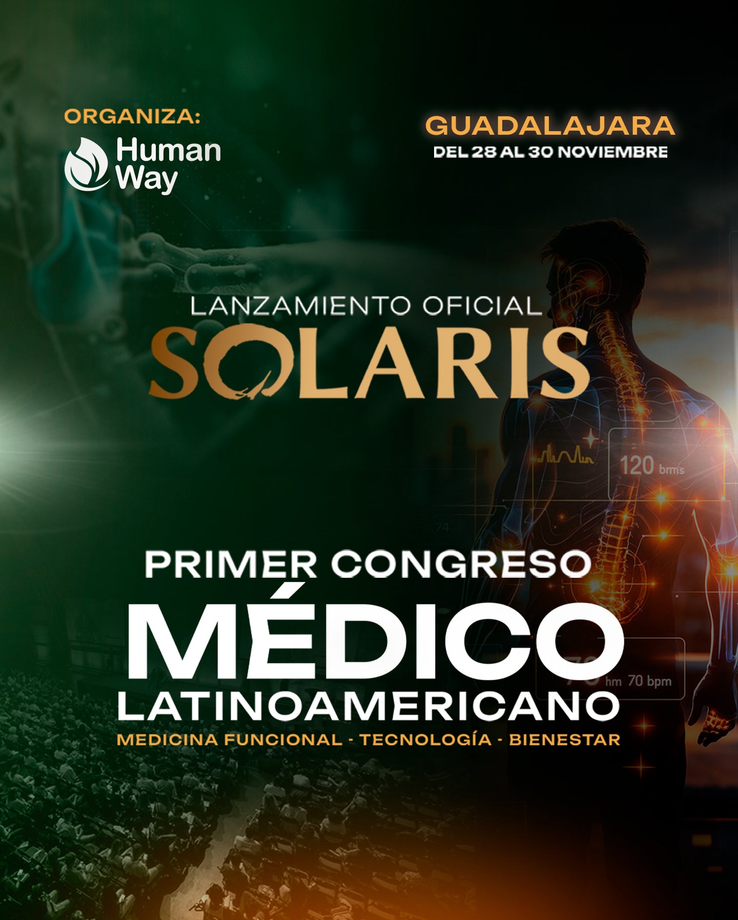Del 28 al 30 de noviembre de 2025 en Guadalajara, México, se llevará a cabo el Primer Congreso Médico Latinoamericano, organizado por Human Way. Este congreso marca el lanzamiento oficial de Solaris y reunirá a especialistas en medicina funcional, tecnología y bienestar de toda Latinoamérica.