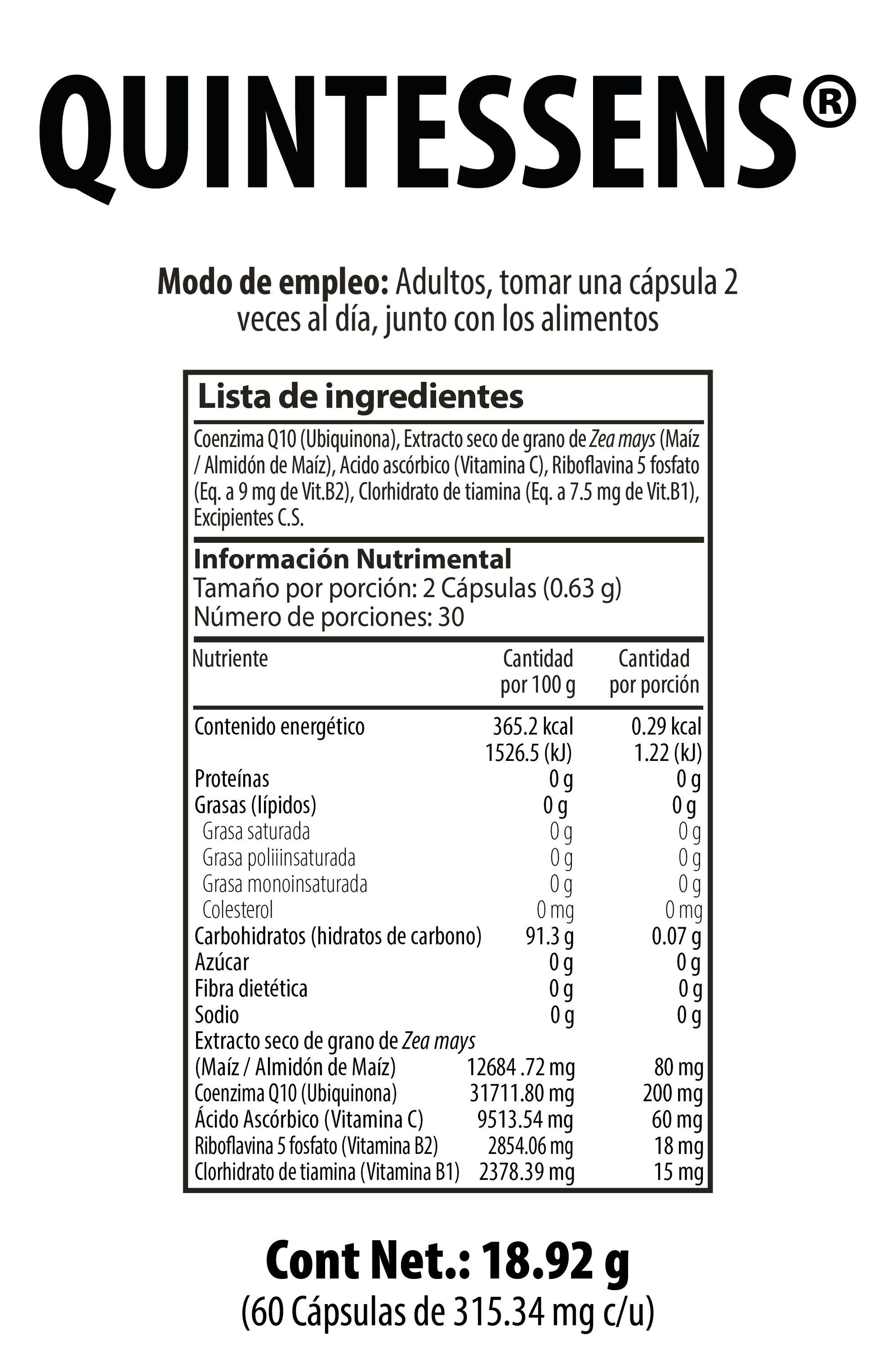 Fórmula con Coenzima Q10 (Ubiquinona), Riboflavina y Tiamina.