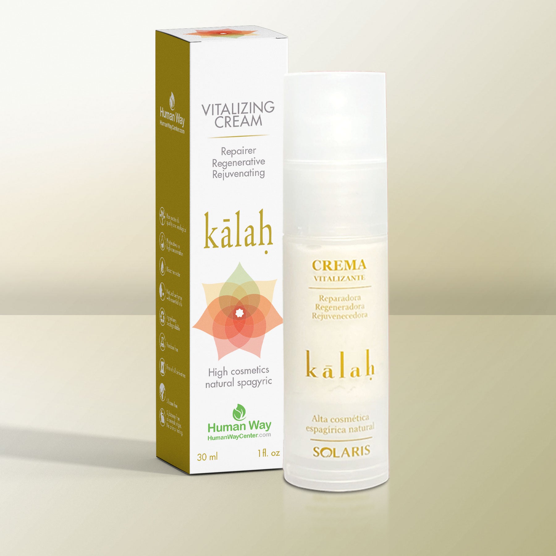 Crema vitalizante kalah de solaris, es una crema de día y noche de alta cosmética, formulada con materias primas de calidad y ecológicas con acción reparadora, regeneradora y rejuvenecedora, con sales revitalizantes biodinámicas de carbonato de potasio tratadas espagíricamente, para todo tipo de piel.