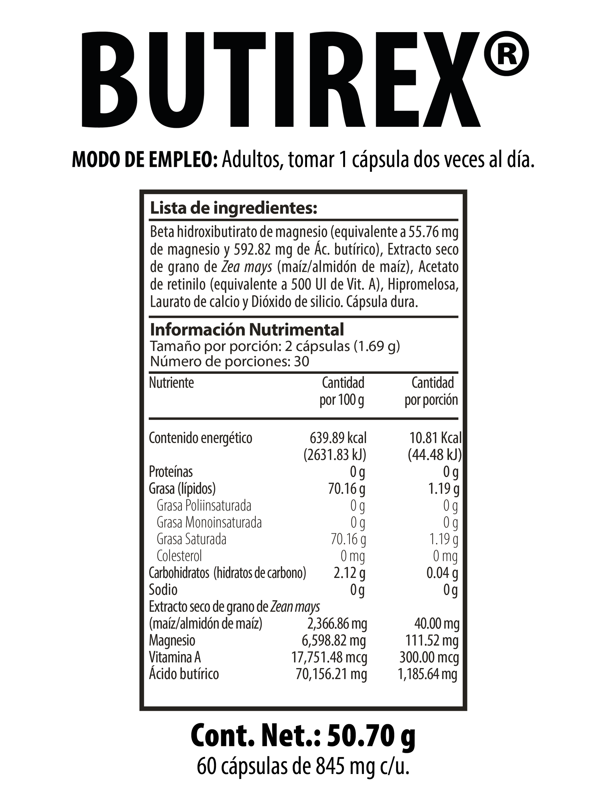 Formula with Magnesium Beta-Hydroxybutyrate and Vitamin A. Its purpose is to complement total dietary intake.