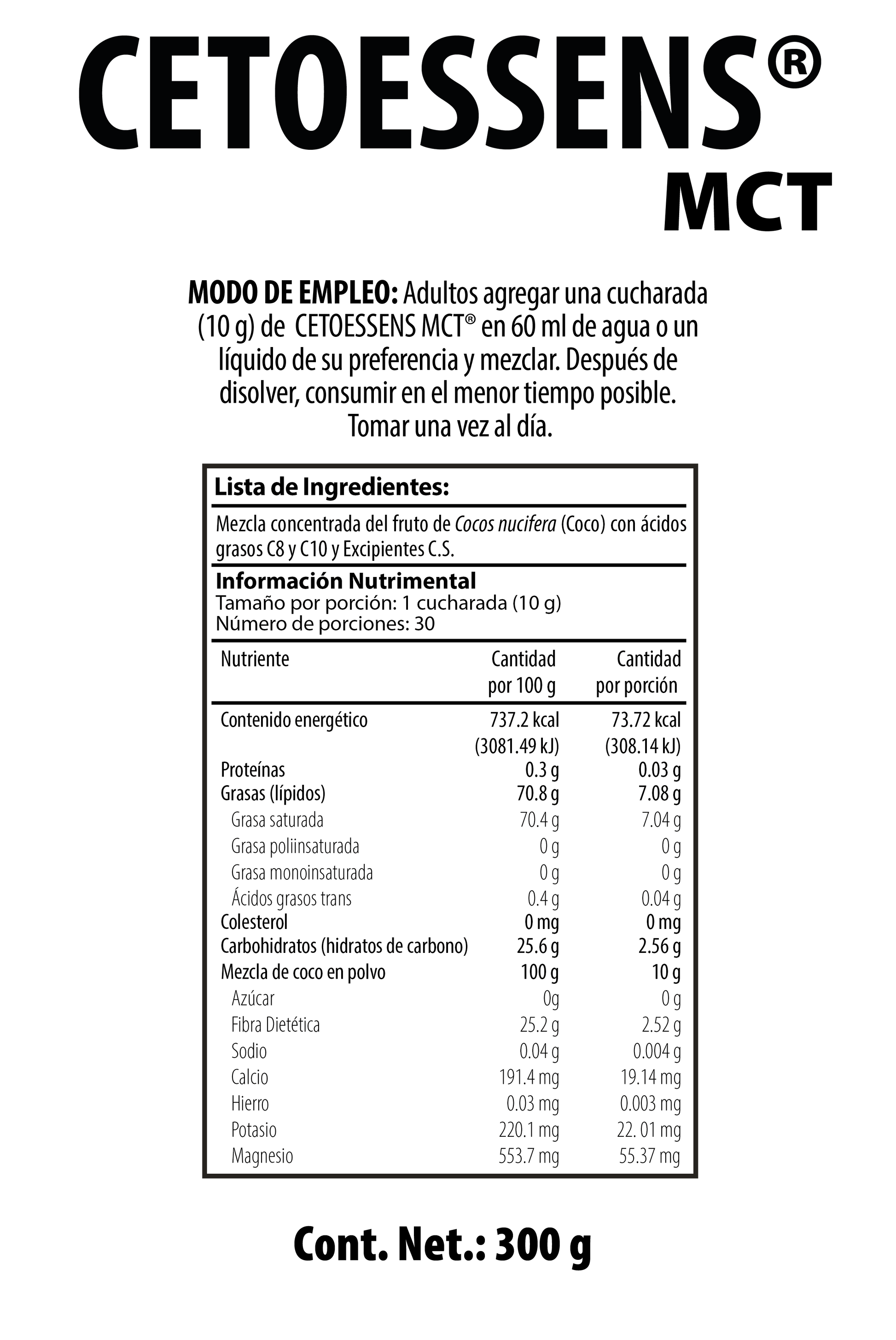 Formula with a concentrated blend of Cocos nucifera and Medium-Chain Triglycerides. Its purpose is to complement total dietary intake.